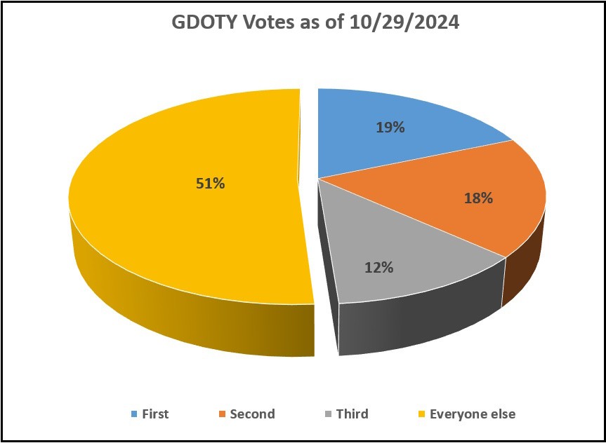 Only two days to go!! The GDOTY voting is the closest is has ever been between first and second. There has even been some back and forth in who is leading. Fourth place has just over half the votes of third place but is certainly not out of it.