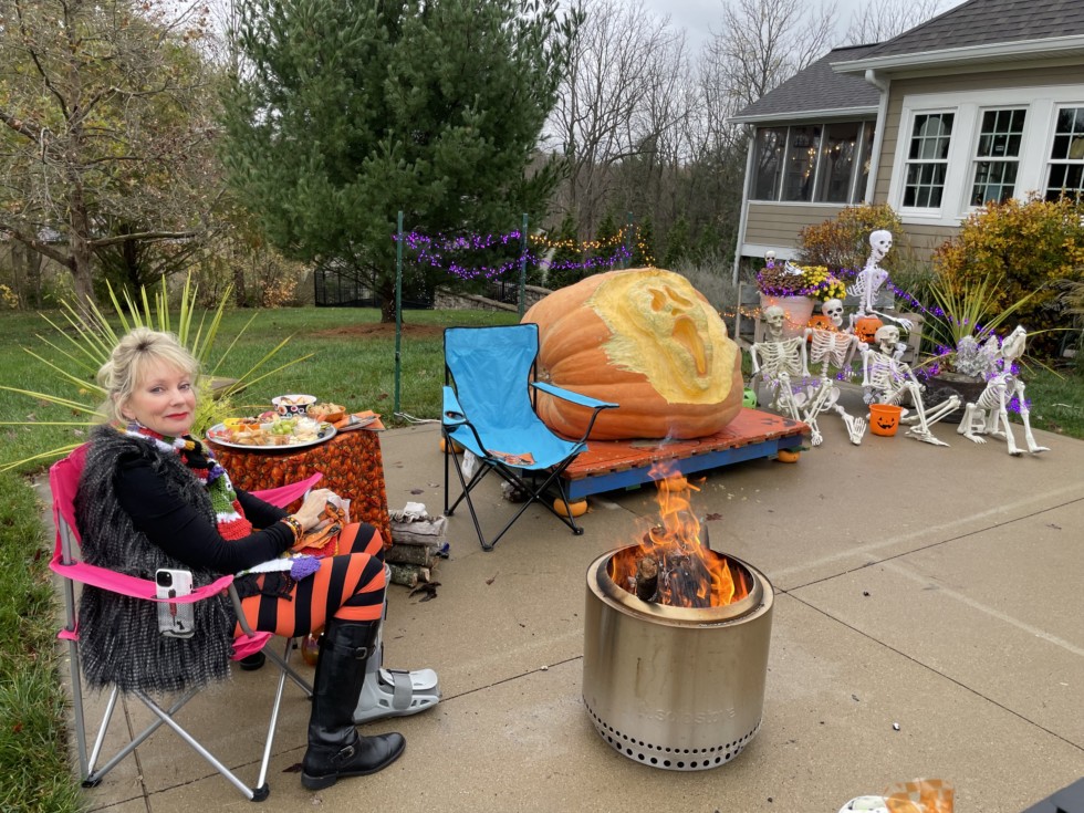 My wife patiently awaiting the arrival of the trick-or-treaters.