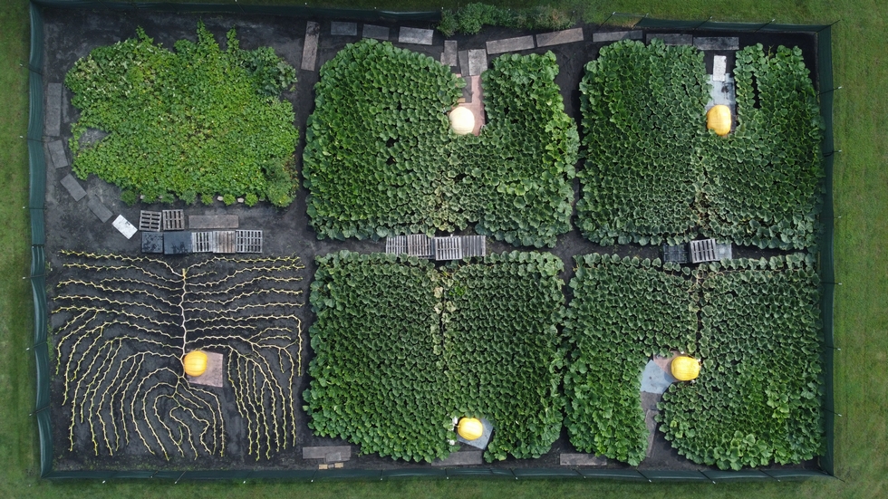 ...and now to skeletonize a plant for educational purposes. I took extra time to cut off all the leaves and stalks to show the hidden vine pattern. Not often a pumpkin dead stops growing with suspected fusarium in the roots and vines clogging up the works. Dang early season excessive rains.