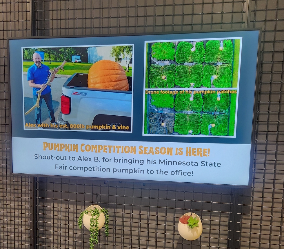 I started a new job last fall, but had taken the year off, so nobody knew I grew pumpkins. So I told everyone this fall I'd bring the pumpkins by...always amazing there are folks out there who have not seen these things by now. They liked it so much they put some photos on the company montiors that were also shown at our plants in Arizona and Ohio. Pretty cool!