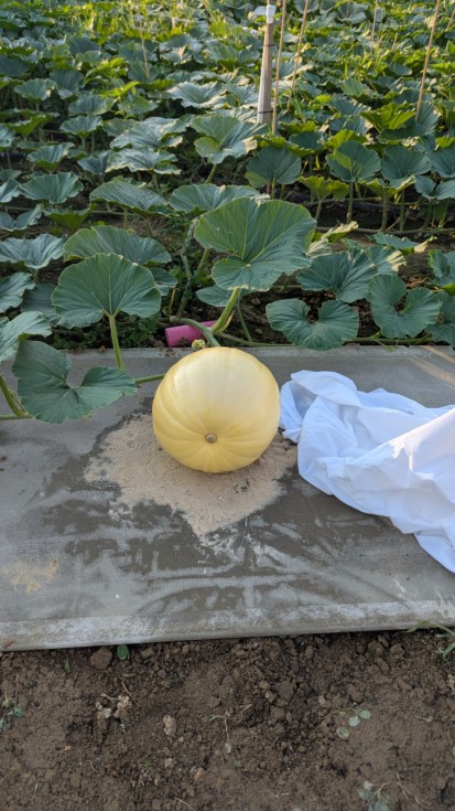 2021 Hoornstra 14 DAP. I think this one is smaller than it would have been because I waited too long to cut the backup pumpkin which was pollinated first. This plant has been the smallest, hopefully can get some more vegetative growth out of it, it's looking better than it was. 2021 Hoornstra x 2196 Zappa