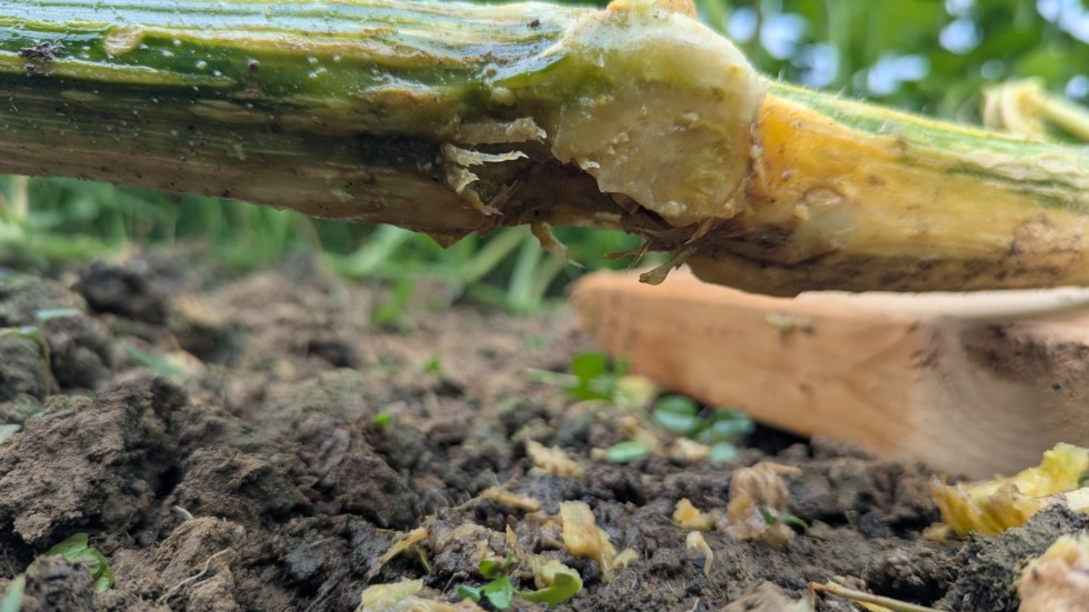 If this grower diary had a title it would be something like Year One, Lessons Learned the Hard Way I have not done a good job keeping my mains cleared and checking them thoroughly. I found this on the 2344 Wallace today. One node was sitting in a depression and with all the rain we've had it started to rot the vine. I lost a secondary and it is about 1/3 the way through the main. I scraped out all the rot I could, sprayed it with alcohol, made a shelter for it and put a fan on it. Not sure what else to do and if it's going to be alright or not. This is about 10ft out from the stump.