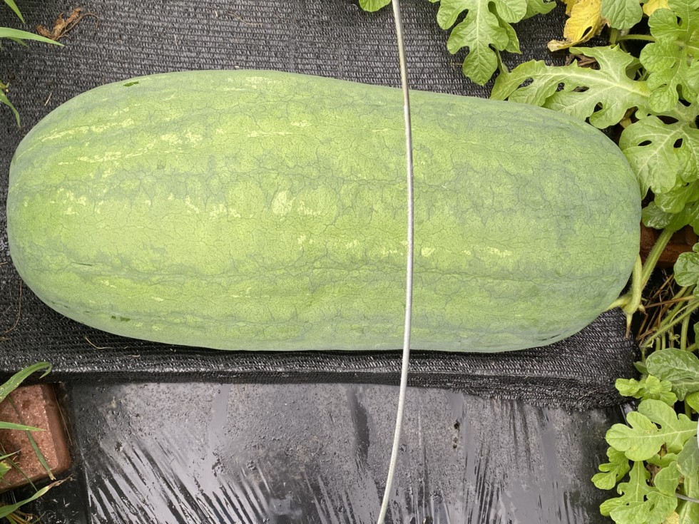 This melon is also from a Lloyd Bright seed, it is an F2 generation seed that was from a Tom Watson X Carolina Cross . This plant was from a white seed and all the melons on this plant have some striping aand are super looong. I would love to get this one to 150 pounds or more. Just like with tall skinny people it's also hard to put weight on a long skinny melon!