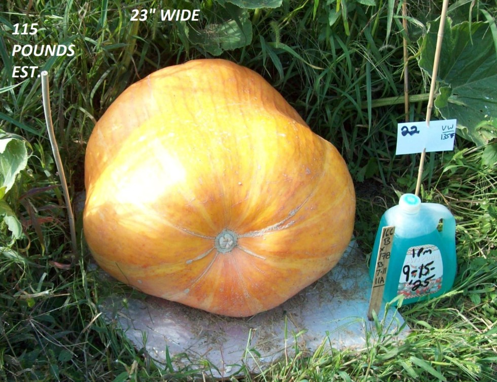 My #22, 166B fruit, further exemplifying that if a fruit is gonna be smaller, it is more likely to be orange, OR there is a nutrient difference between the two main patches that is affecting the color potential. Hmmm, however, I did have a 166A & 166C growing, as well; They were creme-colored from the start to their just-88-pounds, and huge birdbath, finishes. I'm happy either weigh---The 88-lber sold VERY early-on! eg