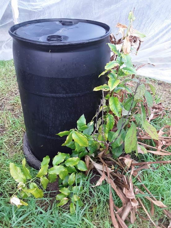 Lemon tree, avocado tree, and ginger... The ginger was the first to go down, but the bulb should still be alive. A warm winter so far. No heat keeping these alive except the black barrel and loose plastic coverings.
