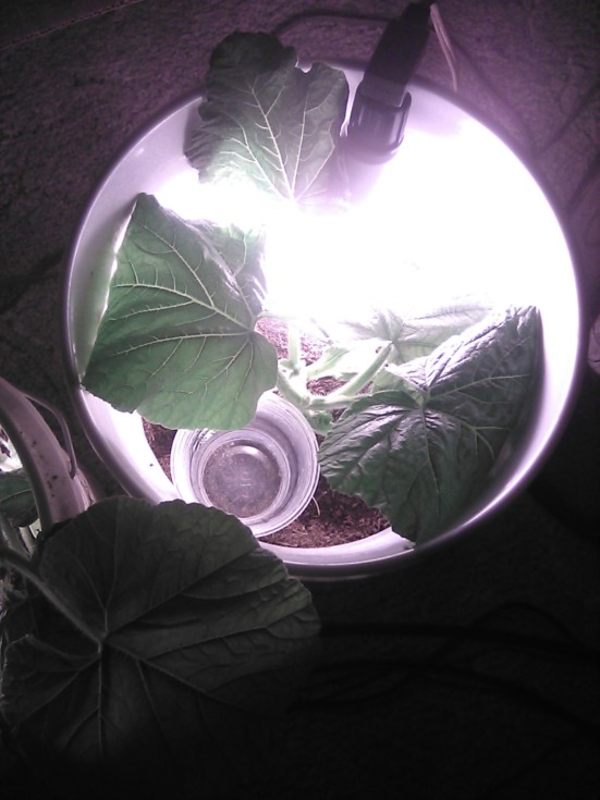 Here's my 443 test plant in bucket #2; It's not possible to show the gigantic, 27-watt/200-Watt-equivalent bulbs from Walmart, lol; The glare of 3000 Lumens is just too much! My light at the usual end of the couch has a switch that is 'hanging by a thread' and it literally was threatening to be a fire hazard, so, only the other end of the couch will be for 'High-Powered' seed testing, lol. And even then...cooked the main vine. Well, I'll know, next time. This is a '14 seed. Sprouted effortlessly - now it grows stockily. The extra cup has awl-pricked, OUTWARD holes X 3 in it for if I add water-soluble fertilizer, it does not disturb the soil that would be otherwise and reduces thermal shock just SlIghTly. eg