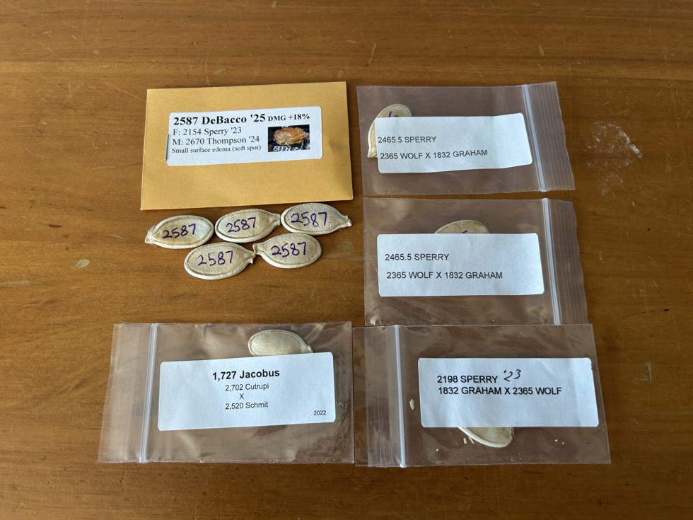 Seed starting round 1: Today I'm starting my seeds for my 2 full sized plants. First choices: - 2587 Debacco DMG: Grown 15 minutes from me, massive and heavy, insane plant health and sustained growth until the end, pollinator was a very aggressive 2670 plant belonging to Hayden R. Easy choice! - 2465 Sperry: Proven monster maker, would have had even better results last year if a few big ones didn't go down to rot right at the end. Backups: - 1727 Jacobus: People say this seed is "bomb-proof" AKA it splits way less than other top seeds. I think that makes for a good backup and maybe pollinator. They're ugly too which I like. - 2198 Sperry: Easy choice, this is only a backup because the seed is kinda beat up. I still give it an 80% chance of sprouting though.