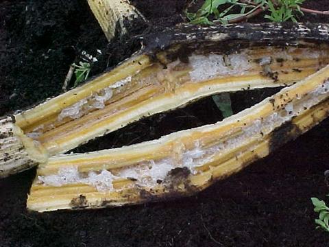 This is the main vine about 8 feet from the stump.It felt and looked healthy when I dug it up ( not collapsing like the same vine did about 16 ft out) When I cut it open I see this foaming stuff. Next photo will show the stump of same plant.