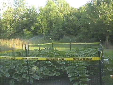 Here is a picture of the pumpkin patch. My son Scott put the yellow police tape around it. I have two pumpkins on two primary vines on one plant.