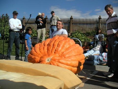 Brian with his 810 EXH pumpkin on the scales. Even though Brian handicaps himself with those bright orange pumpkins (just kiddin' Brian! ) he's been the most successful grower at Thanksgiving Point the past 2 years. Small cracks were all that kept him from winning the event this year. Thanks Brian for hauling those 2 beauties that distance for us all to look at!
