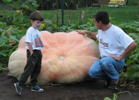 Here is my 840 just before leaving the patch for Topsfield. I was grown on the 805 Pukos 2000 and self-pollinated. The final measurements were: 163-Circ., 95 side-to-side and 84 end-to-end for a total of 342 inches OTT and an estimated weight of 802 pounds.