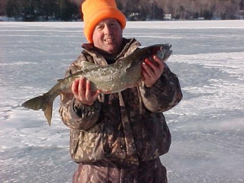 mike ditched us and walked 200yds away and caught this 7lb 15oz Laker @28"