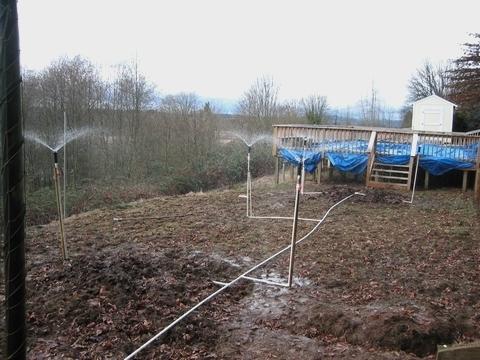 Here is my new irrigation system my dad and I built today. We still need too make a few adjustments but it should work very well this summer. Sprinklers have a good spray and can be used as misters also. This is my new patch, I will plant two plants here. The two mounds are mounds of leaves composting and also the location where the two plants will be planted. This fall I added about 12 cubic yards of horse manure and about 200 pounds of Lime. The patch is approximately 1100 sq ft.