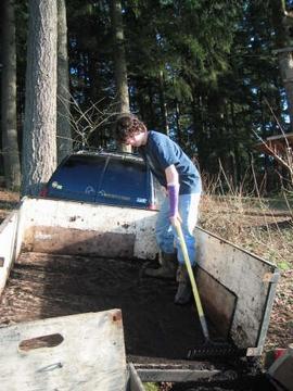 Here I am today just finishing up unloading 2 yards of hot, black leaf compost that we bought. I added a yard of compost to each hill, because of the awkward location of my patch you can't back up onto it so I have to cart each load to the spot where I want the dirt.