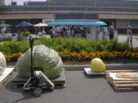 Tom's 673 squash is on the left and my massive pumpkin is on the right. It weighed an amazing 60 pounds, just enough for last place!!!