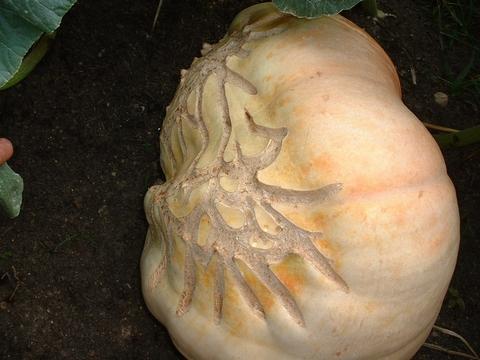 In an effort to stop us from eating all of his tastey vegetables, David decided to share his greatest ever growing accomplishment with the Mysterious Metro Growers of the Insane Pumpkin Posse. David has invented the "Pre-Carved Pumpkin". Seen here for the very first time. Dave just blows the pumpkin up like any good abort with heavy doses of potash. Then he applies "Warren's Healing Tonic" to the injury. And here we have the fine results. No rot at all. Imagine what it can do for simple blossom end spilts!