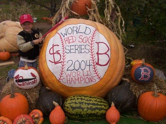 This giant pumpkin was painted on Oct.23, start of the World Series. Two days ago, I had to fill in RED SOX, WORLD CHAMPIONS! Seen in photo is Danny's son, Michael. And yes, the Dill Family are huge Red Sox fans! Diana