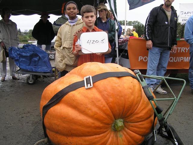 Young Mr. McMullen proudly displays his 420.5 pound pumpkin, which came in 23rd place at the 2005 Frerichs Farm weighoff.