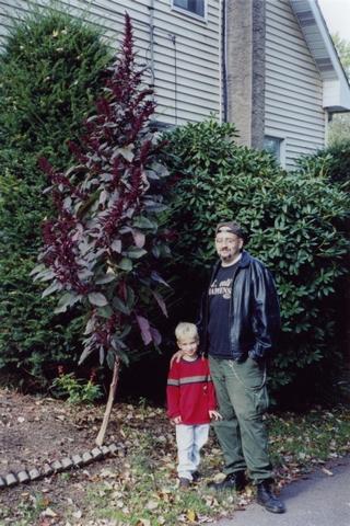 Picture of my newphew and I standing next to my nearly 10 ft. tall Amaranth in PA. The stem base was 5 1/2 inches in circumference. Usually these plants are entirely red. Every year I get a few of these plants with green leaves. They are usually taller, and are generally around 9-10 ft. tall. They don't seem to produce as many seeds as the pure red ones. I've seen some that don't produce any seeds at all. The seed heads are also not as soft, and are a bit prickly compared to the red. My plants probably crossed with someone else's plants and this is a hybrid of some sort. This particular plant produce a fair amount of seed; so I'm planting them next year. I've been waiting to get my hands on this picture since Oct. My wife's mom took this in Oct, and she just got the pictures developed.