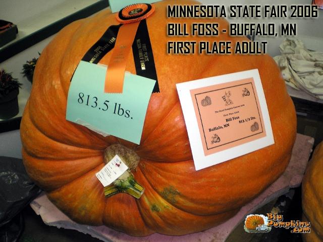 Minnesota State Fair 2006 Adult First Place belongs to Bill Foss of Buffalo, MN. A beautifully rounded pumpkin with well defined ribs and a dark orange color astounded the masses, including myself. -stormrat16
