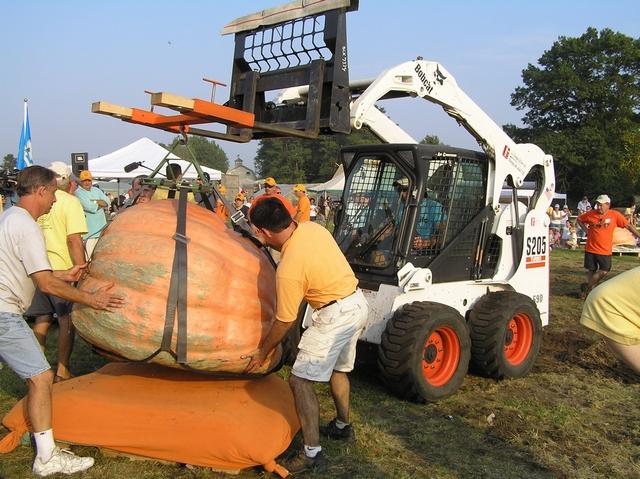 The Big Bob Cats worked hard to lift Mike Olivers 1317 pound entry, at the SNGPG Frerichs Farm 2007 Gaint Pumpkin weigh-off in Warren RI.