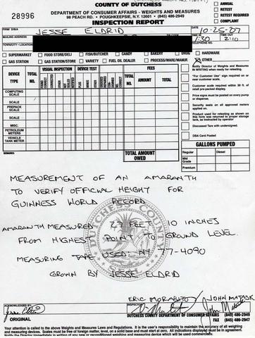 New York state gardener/farmer Jesse Eldrid specializes in growing heavy, tall, and large vegetables and annual plants. On October 25th, 2007, after a long summer of working, watching, and waiting, he finally contacted county officials in order to obtain a legitimate measurement of the Amaranthus Australis plant he had been growing since the beginning of the year. When Jesse contacted the local bureau of weights and measures, he knew that he had a record-breaking plant -- but he didn't know that his plant would be almost twelve feet (11.98) taller than the the goal he had set for himself in the existing record: the official measurement of the plant, he would learn that afternoon, was 27'10".