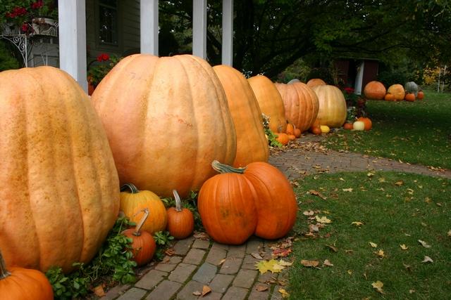 11 giant pumpkins and squash in front our our house near Rochester, NY