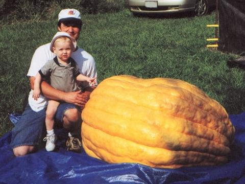 Here is a shot of my 552# pumpkin (Mothra II) that went down early due to a dill ring split. My 2-year-old son refused to sit on it, but was brave enough to touch it with one finger.