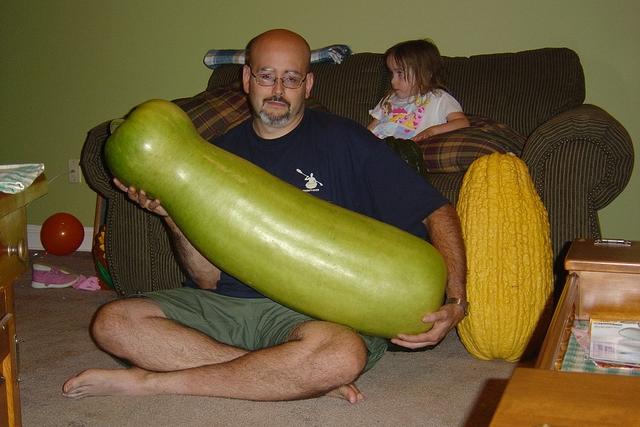Picture of me holding a zucca gourd (a.k.a. zucca melon) I'm not sure how much it weighs because I don't have a scale. It's probably at least 50 lbs.