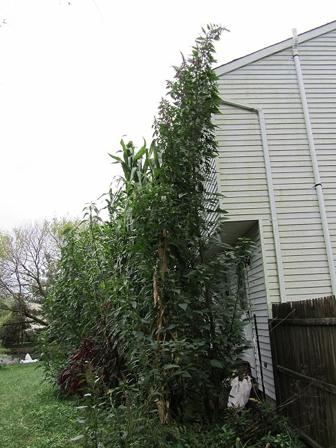 Picture of a sterile hybrid amaranth (Amaranthus hybridus X Amaranthus australis) along the back of the house. This plant is several feet higher than the second story gutter. Probably 22-23 feet tall.