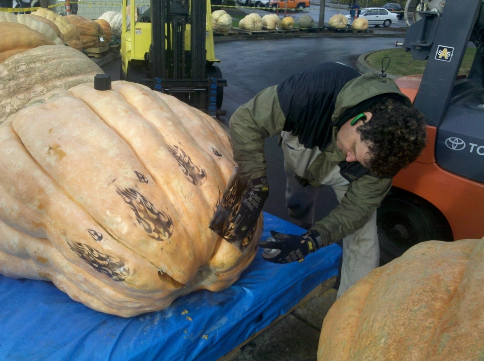 Ron Barker painting flames on the "smoke on the water" pumkin-boat
